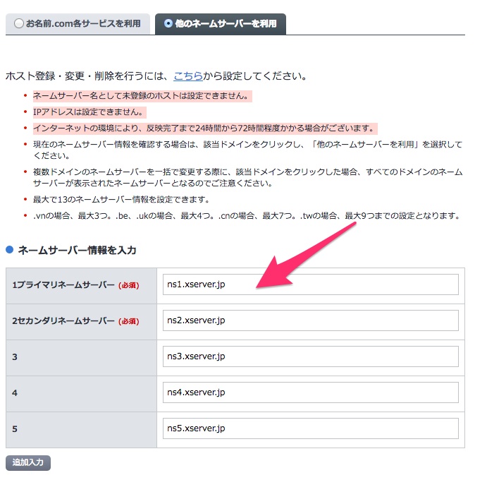 このxserverからメールで来たネームサーバーの情報を、お名前.comの「他のネームサーバーを利用」を押すと表示される「ネームサーバー情報を入力」というフォームに入力します。